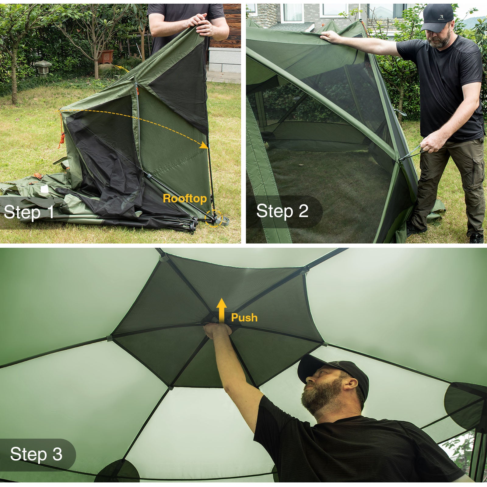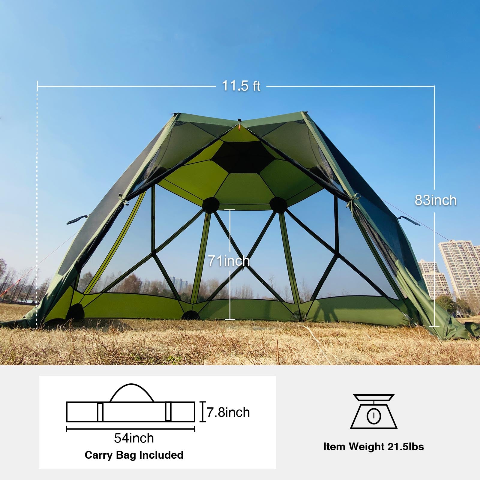 Pop-up Gazebo Screen Tent easy to set up and take down,the durable polyester coated with UV resistant material, 11.5' x 9.8 ft up to 6 people. It easily fits a picnic table inside and chairs,extra Compact Folded Size gives great outdoor portability. MANUAL