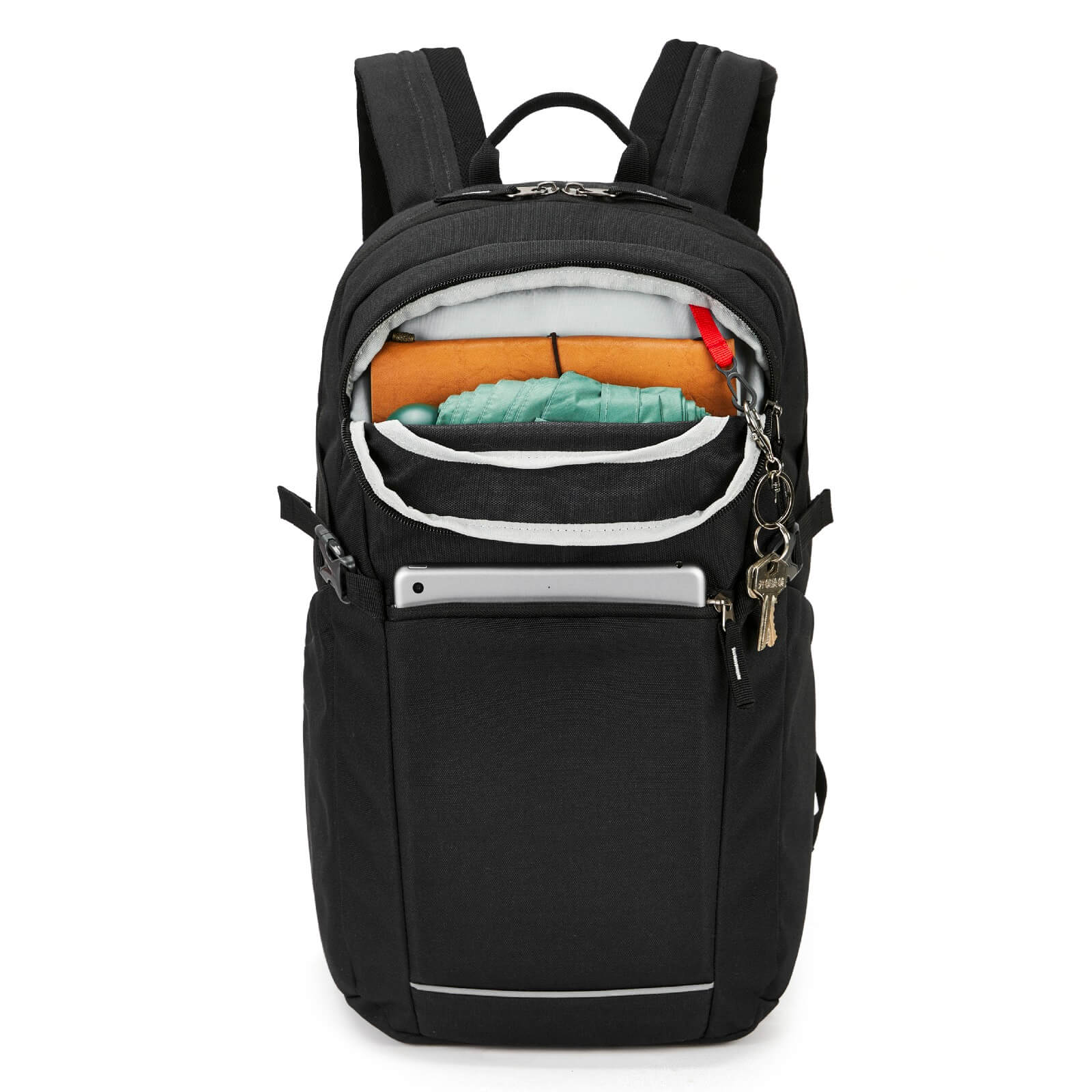 This work backpack has two front pockets with a key hook and phone pocket, making your items organized and easier to find. Two bottle pockets on each side with an adjustable open strap to fit the different diameters of bottles. Suitable for multi-occasion such as school, office, gym, airline, travel vacation, etc. This Bookbag is also a good choice for students and teachers.