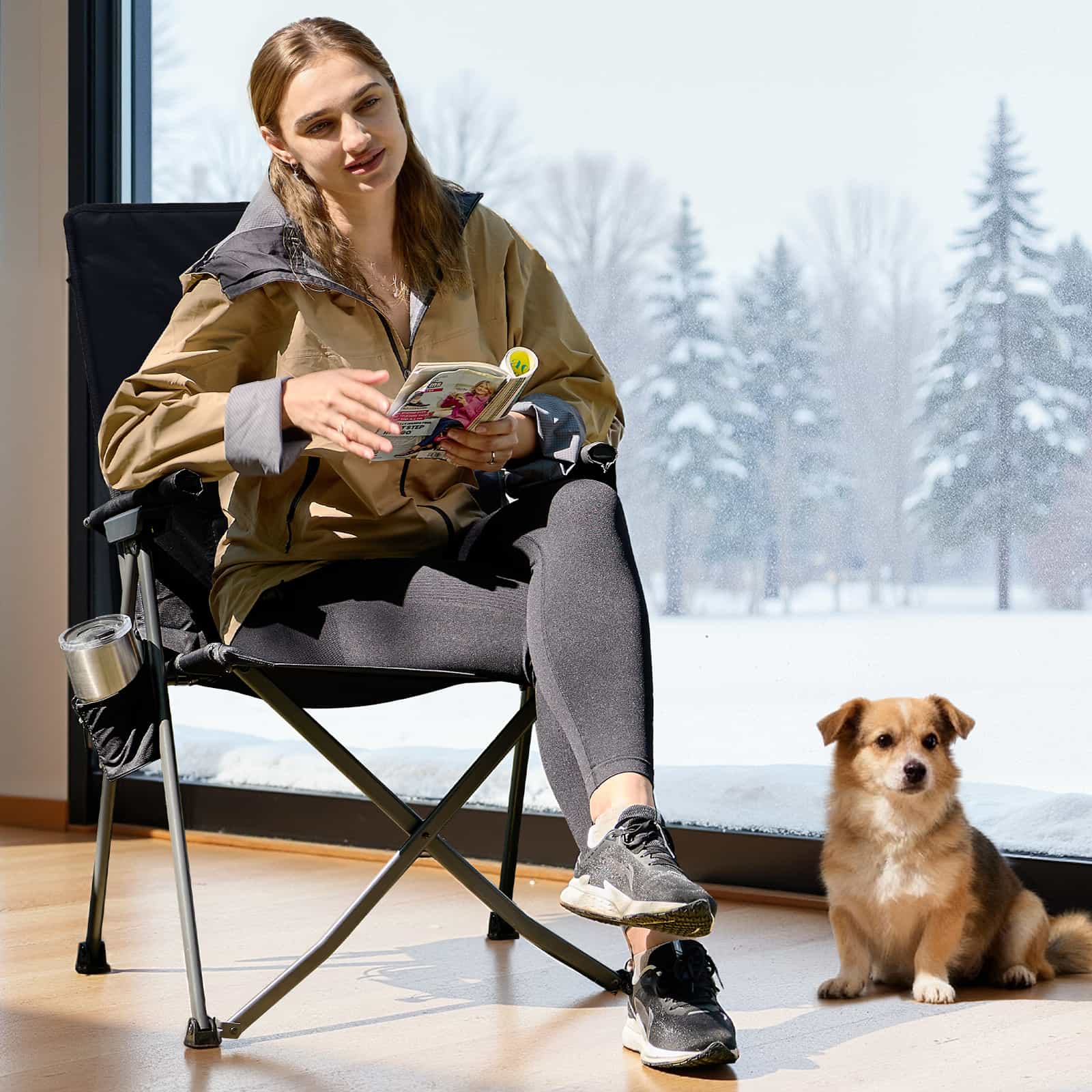 This tall heated camping chair features dual heating zones for back and seat, which ensure warm and comfort for you even in the winter outdoors. And this heated folding chair will heat up in just 8s and then you can enjoy happy time with our chair.