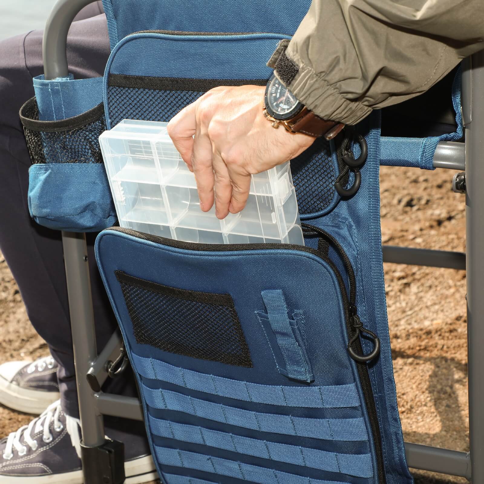 It will store all your fishing tools and accessories! A small bag holds pliers, scissors, and other tools. Large bags can place two 3600 tackle boxes. Countless webbing belts can place knives, flashlights, and other accessories. Mesh pockets of the portable fishing chair can be used for cups or phones.