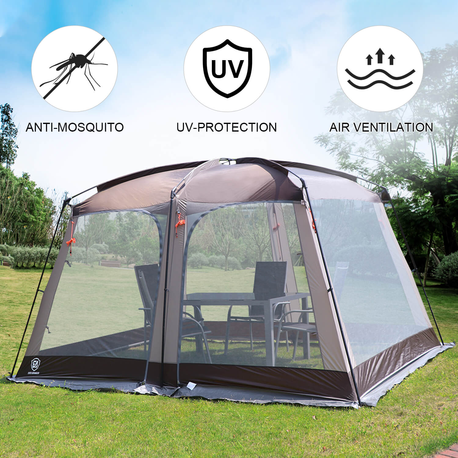 Camping screen house rooms' open size is 12 x 10 ft, 85-inch height. The large enough space for 8-10 adults, and a huge interior space for camping equipment. It's perfect for the garden or backyard for parties, afternoon tea times, or picnics.