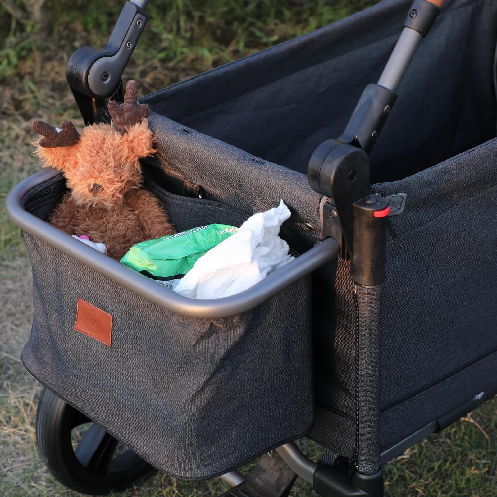 The side zipped entrance of the wagon stroller with a secure hook lets kids have safe and free access and relieves the fatigue of adults who frequently pick up and put down toddlers. The whole fabric can be removed to make a thorough cleaning and provide cozy and healthy riding for children.